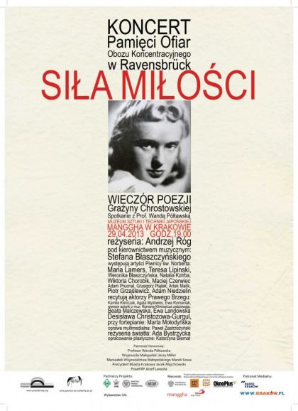 W dniu 30 kwietnia tego roku przypada sześćdziesiąta ósma rocznica wyzwolenia Obozu Koncentracyjnego w Ravensbrück. Pragnąc uczcić pamięć ofiar obozu, Stowarzyszenie Prawy Brzeg wzorem ubiegłego roku organizuje drugie już spotkanie pod nazwą „Siła Miłości”. Tym razem przyjmie ono formę wieczoru poezji Grażyny Chrostowskiej, rozstrzelanej w KL Ravensbrück w 1942 roku.