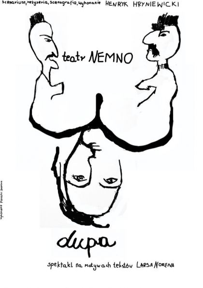 "Pusta scena, a na niej nadnaturalnych rozmiarów anonimowa dupa. Zderzeni z tym niezwykłym, zawłaszczającym przestrzeń sceny rekwizytem, dwie pacynki i animator zostają zmuszeni do skonfrontowania się z rzeczywistością i zdefiniowania raz jeszcze swojego miejsca w świecie. W ten sposób niewyszukana metafora przegranego życia daje początek rozpisanej na trzy głosy opowieści o ludziach z marginesu społecznego.