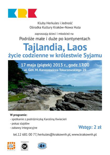 To kolejna odsłona cyklu Podróże małe i duże po kontynentach prowadzonego przez Kluby Herkules i Jedność Ośrodka Kultury Kraków-Nowa Huta. W programie wydarzenia znajdzie się: spotkanie z podróżniczką Karoliną Kwiecień oraz pokaz slajdów, a także zabawy pokazujące różnorodność kulturową w królestwie Syjamu.