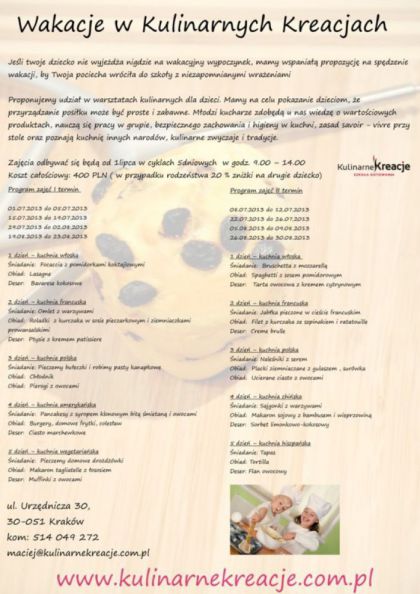Cena obejmuje: 5 dniowe warsztaty kulinarne, zakup wszystkich potrzebnych składników, z których dzieci wykonają potrawy, napoje, fartuszki, opiekę wykwalifikowanych osób dorosłych. Każda dodatkowa godzina po wcześniejszym ustaleniu + 20 PLN