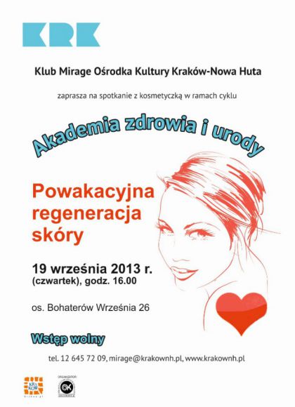 Klub Mirage Ośrodka Kultury Kraków-Nowa Huta (os. Bohaterów Września 26) zaprasza panie na kolejne spotkanie z konsultantkami kosmetycznymi w ramach cyklu Akademia Zdrowia i Urody, które odbędzie się 19 września o godz. 16.00