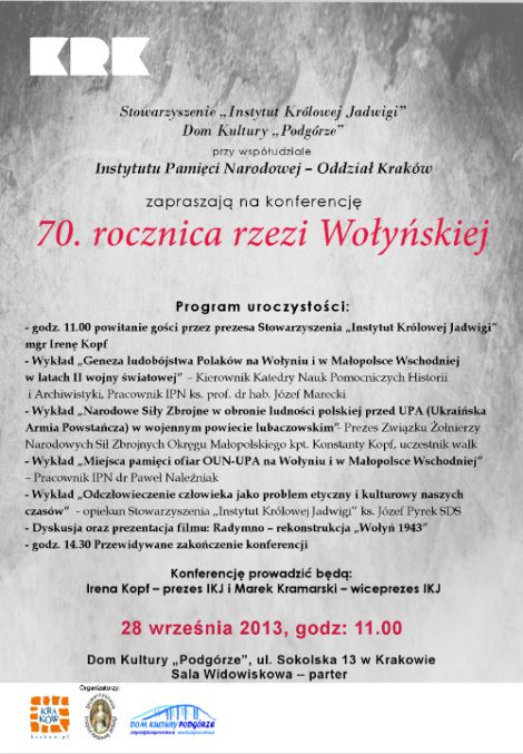 Stowarzyszenie "Instytut Królowej Jadwigi", Dom Kultury "Podgórze" przy współudziale Instytutu Pamięci Narodowej – Oddział Kraków zapraszają na konferencję dotyczącą 70. rocznicy rzezi wołyńskiej.