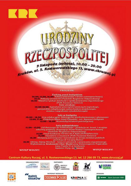 Będzie to całodzienna impreza z okazji Święta Niepodległości z mnóstwem atrakcji. W programie m.in.: salwy wiwatowe, pokazy szermierki, gry wielkoformatowe, warsztaty biżuterii patriotycznej, prelekcje a na zakończenie dnia koncert piosenek z powstania styczniowego „Idźmy, bijmy Moskali” w wyk. Krakowskiego Chóru Męskiego i Kwintetu Dętego Passionart.