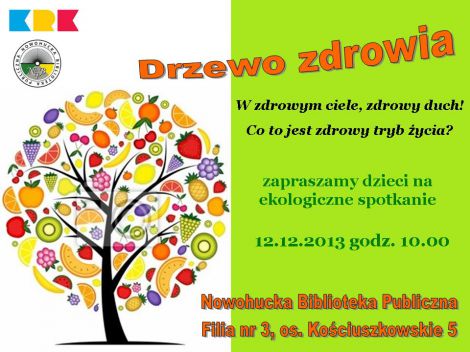 Nowohucka Biblioteka Publiczna w Krakowie zaprasza najmłodsze dzieci na ekologiczne spotkanie pn. „Drzewo zdrowia” w cyklu: „Nasz ekoświat”. Biblioteka od wielu lat prowadzi proekologiczną działalność edukacyjną skierowaną do dzieci i młodzieży z nowohuckich przedszkoli i szkół. Organizowane są: wystawy, prelekcje, warsztaty i lekcje biblioteczne oraz konkursy plastyczne o tematyce ekologicznej.Działania koncentrują się wokół tematyki zapobiegania degradacji środowiska, właściwego korzystania z wód, ochrony dziedzictwa przyrodniczego, ochrony zwierząt i edukacji prozdrowotnej.