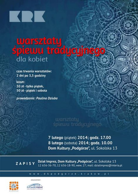W DK Podgórze odbędzie się spotkanie ze śpiewem tradycyjnym (zwanym białym). Ta technika śpiewu naturalnego, pełnym głosem - charakterystyczna dla pieśni ludowych, daje niesamowite możliwości ekspresji i emisji głosu.