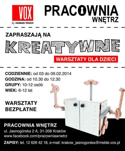 Co najważniejsze, warsztaty są bezpłatne i otwarte dla wszystkich chętnych. Chęć uczestnictwa należy zgłaszać na adres: krakow_jasnogorska@meble.vox.pl z tytułem wiadomości „Warsztaty zimowe” lub tel. (12) 626 42 18 z podaniem imienia i nazwiska, adresu, numeru telefonu oraz adresu mail.