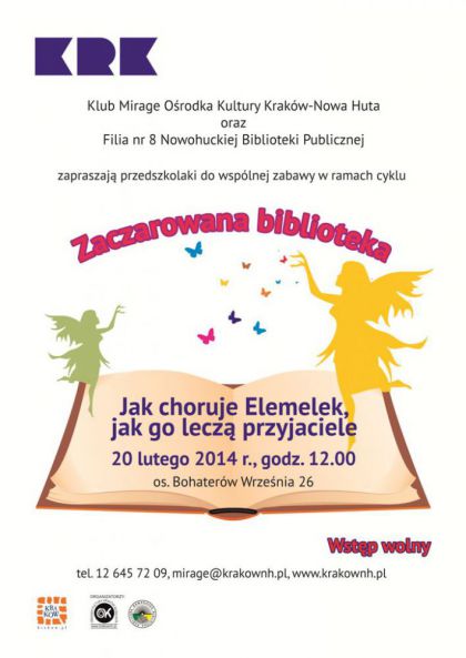 Kolejne spotkanie dla przedszkolaków w ramach cyklu Zaczarowana biblioteka w Klubie Mirage Ośrodka Kultury Kraków-Nowa Huta (os. Bohaterów Września 26). Zajęcia zawierają elementy dramy i ćwiczeń oddechowych, a polegają na czytaniu i analizie bajek. Bajki poddane zostaną analizie w formie zabaw ruchowych, plastycznych i muzycznych. Współorganizatorem cyklu jest Nowohucka Biblioteka Publiczna.