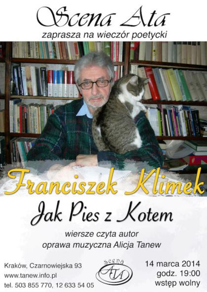Franciszek J. Klimek -Krakowianin z urodzenia i wyboru . Emerytowany muzyk, ale nie emerytowany poeta. „Koci poeta” jak podkreśla mówiąc o sobie, ale wbrew temu co mówi, Franciszek Klimek nie jest wyłącznie „kocim” poetą i nie wyłącznie poetą, chociaż ostatnio ulubione koty, kotki i kocięta są głównym motywem jego twórczości.