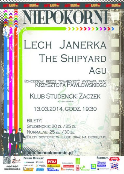 Dużo muzyki alternatywnej w jeden wieczór! Kiedy? W czwartek, 13 marca. Gdzie? W Krakowskim klubie Żaczek. W ramach cyklu Niepokorni zagrają Lech Janerka, The Shipyard i AGU. Koncertom towarzyszyć będzie wystawa rysunków Krzysztofa Pawłowskiego. Będzie to już 47. odsłona cyklu Niepokorni! Start o godz. 19.30.