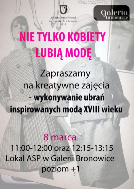 Zajęcia „Nie tylko kobiety lubią modę” odbędą się w sobotę w godz. 11:00-12:00 oraz 12:15-13:15, w lokalu „Akademia w Bronowicach” na poziomie +1 galerii.