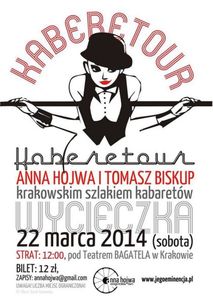 Duet złożony z przewodniczki i kabareciarza zabierze Was w świat dawnego kabaretu, dosłownie i w przenośni. Anna Hojwa (Vintage Tours) oprowadzi po lokalach i opowie o ludziach, natomiast Tomek Biskup urozmaici wycieczkę monologami zaczerpniętymi z twórczości dawnych mistrzów komedii.