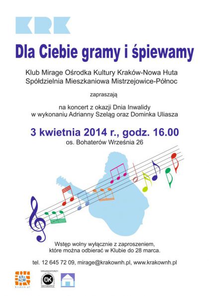 Klub Mirage Ośrodka Kultury Kraków-Nowa Huta (os. Bohaterów Września 26) zaprasza 3 kwietnia o godz. 16.00 na koncert z okazji Międzynarodowego Dnia Inwalidy, podczas którego w szlagierach muzycznych lat 60. i 70. wystąpi duet gitarowy: Adrianna Szeląg oraz Dominik Uliasz.
