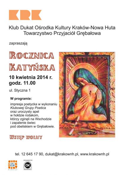 Klub Dukat Ośrodka Kultury Kraków-Nowa Huta (ul. Styczna 1) zaprasza 10 kwietnia o godz. 11.00 na uroczysty apel poświęcony pamięci Ofiar Zbrodni Katyńskiej z 1940 roku.