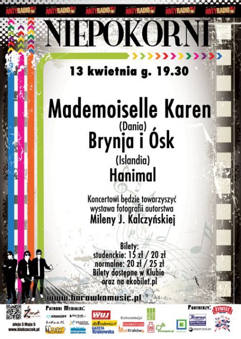 Przed nami kolejna odsłona cyklu NIEPOKORNI. Tym razem na scenie Klubu Żaczek wystąpią: Mademoiselle Karen, Brynja i Ósk, Hanimal. Koncertowi towarzyszyć będzie wystawa prac – fotografii autorstwa Mileny Kalczyńskiej.