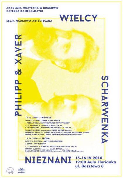 Młodzi Naukowcy Akademii Muzycznej w Krakowie serdecznie zapraszają na spotkanie z muzyką Xavera i Philippa Scharwenków. W dniach 15 i 16 kwietnia 2014 r. o godz. 19:00 w Auli Florianka przy ul. Basztowej 8 zostaną przedstawione sylwetki i twórczość kameralną Braci Scharwenka, których niezwykła spuścizna i bogactwo zapisane w dźwiękach muzyki zasługują na to, by odkryć je na nowo i częściej gościć na naszych estradach. W ramach projektu odbędą się koncerty, poprzedzone krótką prelekcją. Serdecznie zapraszamy na wyjątkowe spotkania z wielkimi dziełami polskiej kameralistyki – z twórczością Xavera i Philippa Scharwenków.