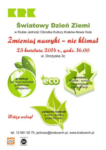 Zmieniaj nawyki, nie klimat - pod takim hasłem odbędzie się impreza z okazji największego ekologicznego święta świata, które obchodzone jest w 192 krajach. Klub Jedność Ośrodka Kultury Kraków-Nowa Huta (ul. Drożyska 3 c) jak co roku włącza się w obchody Dnia Ziemi poprzez organizację warsztatów, na których z materiałów wtórnych i naturalnych wykonywany będzie wiatrak – odnawialne źródło energii. Nie zabraknie również krótkiej prelekcji na temat zmian klimatu i przeciwdziałania globalnemu ociepleniu, a przed Klubem powstanie mini ogródek, gdzie przybyli na imprezę posadzą różne rośliny.