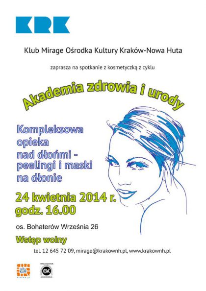 Kolejne mistrzejowickie spotkanie z kosmetyczką w Klubie Mirage Ośrodka Kultury Kraków-Nowa Huta. Uczestnicy dowiedzą się, jakie zabiegi należy stosować w codziennej pielęgnacji, aby zachować piękny i zdrowy wygląd dłoni, które są wizytówką każdej kobiety. W programie prezentacja zabiegów - peelingi i maski połączone za masażem, porady indywidualne oraz kiermasz kosmetyków.