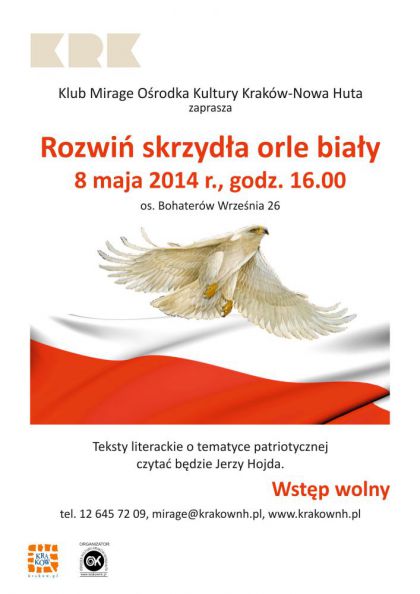 Klub Mirage Ośrodka Kultury Kraków-Nowa Huta (os. Bohaterów Września 26) zaprasza 8 maja o godz. 16.00 na spotkanie z okazji obchodów rocznicy podpisania Konstytucji 3 Maja. Teksty o tematyce patriotycznej czytać będzie krakowski aktor Jerzy Hojda.