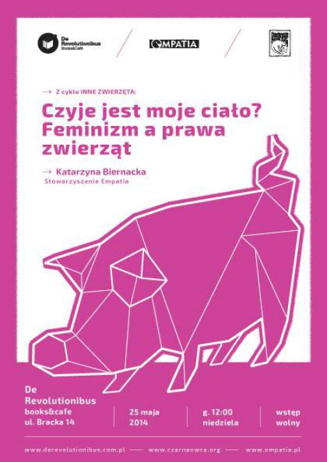 Fundacja Czarna Owca Pana Kota we współpracy ze Stowarzyszeniem Empatia i księgarnią De Revolutionibus. Books&Cafe zaprasza na spotkanie z Katarzyną Biernacką „Czyje jest moje ciało? Feminizm a prawa zwierząt”.