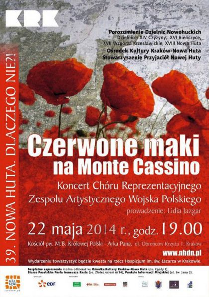 Dzięki organizatorom koncertu: Porozumieniu Dzielnic Nowohuckich – Dzielnicom: XIV Czyżyny, XVI Bieńczyce, XVII Wzgórza Krzesławickie, XVIII Nowa Huta, Ośrodkowi Kultury Kraków-Nowa Huta oraz Stowarzyszeniu Przyjaciół Nowej Huty, w ten majowy wieczór będzie można usłyszeć poruszające serca pieśni patriotyczne. W programie koncertu nie zabraknie utworów takich jak: Bogurodzica, Warszawianka, Pierwsza kadrowa, Ułani, ułani, Rozszumiały się wierzby, Szara piechota, Hej, chłopcy! bagnet na broń!, Marsz, marsz Polonia, Modlitwa obozowa czy oczywiście Czerwone maki na Monte Cassino.