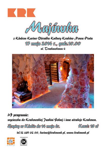 Klub Karino Ośrodka Kultury Kraków-Nowa Huta (ul. Truskawkowa 4) zaprasza na pierwszą w tym roku wycieczka z cyklu wycieczek po regionie w ramach Klubu Młodego Podróżnika, która odbędzie się 17 maja o godz. 10.00. W programie znajdzie się pobyt w Krakowskiej Jaskini Solnej oraz zwiedzanie Smoczej Jamy. Nie zabraknie również odpoczynku i posiłku na statku-restauracji u podnóża Wzgórza Wawelskiego przy moście Dębnickim. Podczas kolejnych wycieczek uczestnicy poszukiwać będą miejsc ciekawych pod względem etnograficznym (folklor, kultura, obyczaje). Zapisy w Klubie do 14 maja (tel. 12 681 02 00, karino@krakownh.pl).