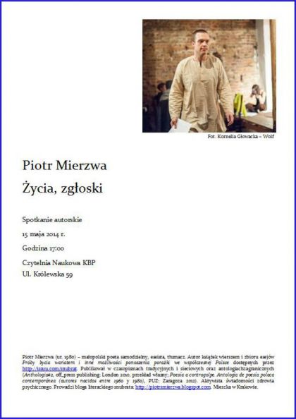 Piotr Mierzwa (ur. 1980) – małopolski poeta niezależny, eseista, tłumacz. Autor książek wierszem i zbioru esejów Próby bycia wariatem i inne możliwości ponoszenia porażki we współczesnej Polsce dostępnych przez http://issuu.com/snubrat. Publikował w czasopismach tradycyjnych i sieciowych oraz antologiach zagranicznych (Anthologia#2, off_press publishing: London 2010, przekład własny; Poesía a contragolpe. Antología de poesía polaca contemporánea (autores nacidos entre 1960 y 1980), PUZ: Zaragoza 2012). Aktywista świadomości zdrowia psychicznego. Prowadzi bloga literackiego snubrata: http://piotrsmierzwa.blogspot.com. Mieszka w Krakowie.