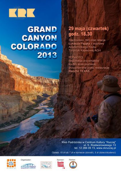 Najbliższe spotkanie Klubu Podróżnika w CK "Ruczaj" poświęcone będzie pierwszej polskiej niekomercyjnej wyprawie kajakowej „Grand Canyon Colorado”, zrealizowanej w sierpniu 2013 roku przez członków Akademickiego Klubu Turystyki Kajakowej Bystrze AGH z Krakowa.