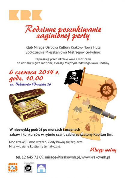 Szalony Kapitan Jim zabierze dzieci i rodziców w niezwykłą podróż po morzach i oceanach zabaw oraz konkursów. W programie imprezy organizowanej przez Klub Mirage Ośrodka Kultury Kraków-Nowa Huta (os. Bohaterów Września 26) gra rodzinna oraz wiele innych atrakcji w Pirackiej Akademii, której uczestnicy będą poszukiwać zaginionej perły. Mile widziane kostiumy w klimacie imprezy.