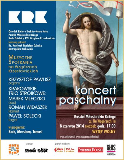 Koncert zamyka liturgiczny okres wielkanocny, zwany inaczej paschalnym, który kończy się Niedzielą Zesłania Ducha Świętego w 50 dni po Wielkanocy. W tym roku Zielone Świątki wypadają 8 czerwca, dlatego też ten dzień wybrano jako datę Koncertu Paschalnego w kościele pw. Miłosierdzia Bożego (os. Na Wzgórzach 1a, Kraków). Wykonawcami będą artyści: Krzysztof Pawlisz – organista o międzynarodowym dorobku artystycznym oraz Krakowskie Trio Stroikowe w składzie: Marek Mleczko – obój, Roman Widaszek – klarnet, Paweł Solecki – fagot.
