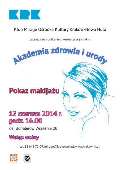 Na kolejne spotkanie z konsultantką kosmetyczną w ramach cyklu Akademia zdrowia i urody zaprasza 12 czerwca 2014 r. o godz. 16.00 Klub Mirage Ośrodka Kultury Kraków-Nowa Huta (os. Bohaterów Września 26).