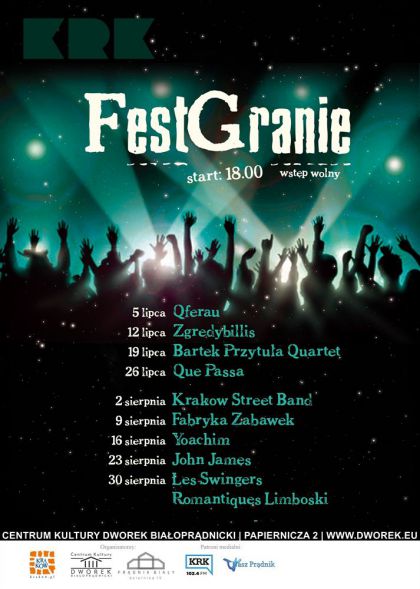 Tego lata Dworek Białoprądnicki proponuje coś nowego – sobotnie wieczory (godz. 18:00) należeć będą do młodych. FestGranie to festiwal, na którym usłyszymy zespoły, które jeszcze nie raz obiją się nam o uszy. Wiele z nich dało się już poznać dzięki świetnym występom w popularnych obecnie programach tj. „Must be the music”, „Mam talent”, czy „X-Factor”. Każdy zespół to muzyczna indywidualność z doskonałym repertuarem. Póki nie wypłynęli na szeroki wody, łapcie w Dworku ich koncerty za darmo!
