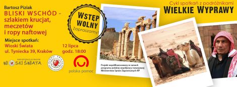 Krajobraz kreowany przez naturę kontra wizja narzucona przez media. Irak, Syria i Jordania to wbrew pozorom nie tylko konflikty i życie w ciągłym zagrożeniu atakiem terrorystycznym. W czasie pierwszego spotkania z serii „Wielkie Wyprawy”, organizowanego w Wioskach Świata – Parku Edukacji Globalnej w Krakowie, Bartosz Piziak – podróżnik i pasjonat Bliskiego Wschodu - pokaże bogactwo kultury mającej odzwierciedlenie we wspaniałej architekturze oraz urzekających krajobrazach i zaprzeczy stereotypowi przypisywanemu przez doniesienia medialne.