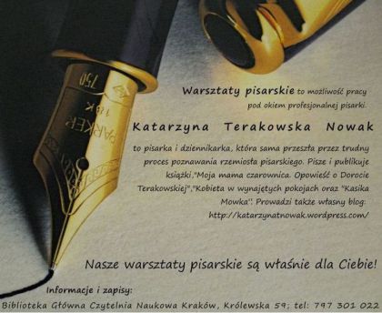 Katarzyna Terakowska Nowak to pisarka i dziennikarka, która sama przeszła przez trudny proces poznawania rzemiosła pisarskiego. Pisze i publikuje książki, "Moja mama czarownica. Opowieść o Dorocie Terakowskiej","Kobieta w wynajętych pokojach oraz "Kasika Mowka”. Prowadzi także własny blog: http://katarzynatnowak.wordpress.com/