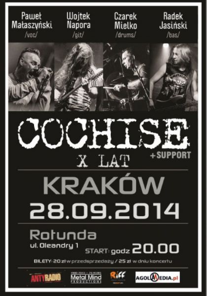 Cochise to zespół grający muzykę, będącą oryginalnym połączeniem rocka, metalu i grunge’u. Grupa powstała w 2004 roku, ale aktywną działalność koncertową i studyjną rozpoczęła cztery lata temu, wydając debiutancki album „Still Alive”. Od tego czasu zespół zagrał ponad sto świetnie przyjętych klubowych i plenerowych koncertów w całym kraju oraz nagrał dwie kolejne płyty wydane przez wytwórnie Mystic i Metal Mind. Premiera najnowszego krążka „118” miała miejsce 10 lutego 2014.