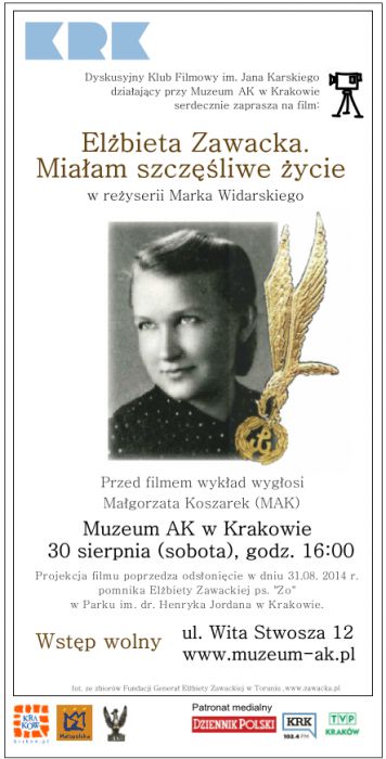 Projekcja filmu poprzedza odsłonięcie pomnika Elżbiety Zawackiej ps. "Zo" w Parku im. dr. Henryka Jordana w Krakowie w dniu 31 sierpnia.