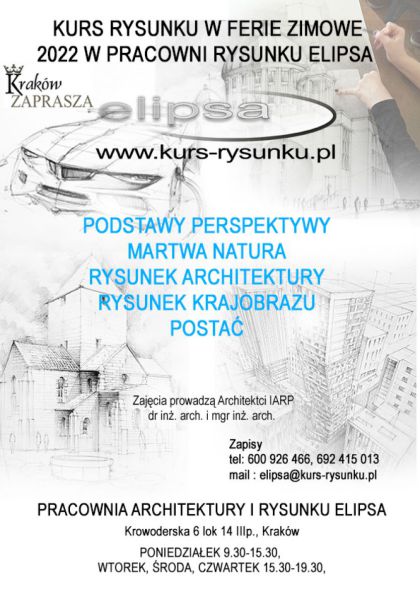 Wykorzystaj czas w okresie ferii zimowych kreatywnie. Naucz się czegoś nowego i poznaj tajniki rysunku przestrzennego, tajemnice i podstawy perspektywy, których nie znajdziesz w żadnych książkach. Zapisz się na zajęcia w Pracowni Rysunku Elipsa. Rysunku uczymy od 20 lat, posiadamy duże doświadczenie pedagogiczne i dorobek naukowy oraz konstruktywnie i zrozumiale przekazujemy wiedzę n.t. rysunku i innych technik. Jeżeli polubisz rysowanie i stanie się ono twoją pasją, możesz podjąć dłuższą naukę i wybrać dla siebie odpowiedni kierunek, a w efekcie zdać i dostać się na studia wyższe jak Architektura, Wzornictwo Przemysłowe, Projektowanie Wnętrz, Architektura Krajobrazu, Grafika i inne. Jeżeli już uczęszczasz na zajęcia lub uczęszczałeś w innej szkole rysunku, ten kurs również jest dla ciebie, podszkolisz swoje umiejętności oraz doszlifujesz warsztat pod okiem czynnych zawodowo projektantów oraz nauczycieli akademickich.