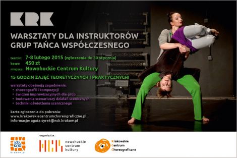 Krakowskie Centrum Choreograficzne serdecznie zaprasza na warsztaty dla instruktorów grup tańca współczesnego, które odbędą się w Nowohuckim Centrum Kultury w dniach 7-8 lutego 2015!