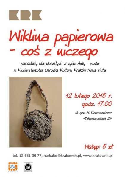 W ramach cyklu Anty-nuda Klub Herkules Ośrodka Kultury Kraków-Nowa Huta (ul. gen. M. Karaszewicza-Tokarzewskiego 29) zaprasza wszystkich, którzy chcą nabyć nową umiejętność, jaką jest wyplatanie przedmiotów z tzw. papierowej wikliny. Jeśli chcesz spróbować, ale nie wiesz jak się do tego zabrać, pokażemy Ci jak to zrobić. Tematem spotkania będą podkładki pod kubki, filiżanki, a także osłonki na kwiatki.