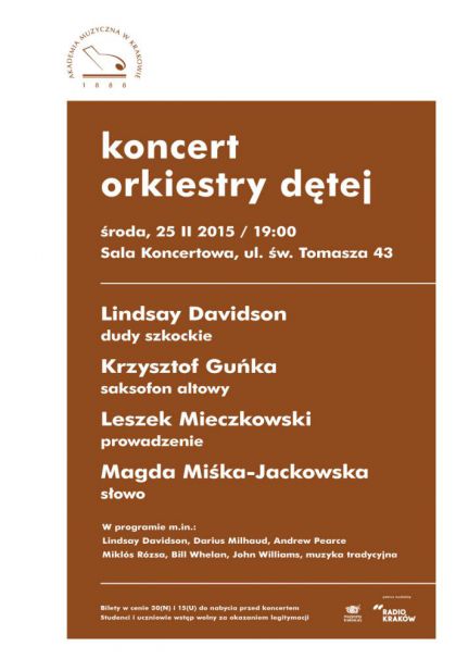 Akademia Muzyczna w Krakowie zaprasza na Koncert Orkiestry Dętej, który odbędzie się w środę 25 lutego o godzinie 19:00 w Sali koncertowej przy ul. św. Tomasza 43. W programie zabrzmią m.in. irlandzkie melodie ludowe wykonywane na dudach szkockich. Solistami koncertu będą Lindsay Davidson (dudy) oraz Krzysztof Guńka (saksofon altowy). Za pulpitem dyrygenckim stanie Leszek Mieczkowski, a wieczór poprowadzi Magda Miśka-Jackowska. Bilety w cenie 30N i 15U zł do nabycia przed koncertem. Studenci i uczniowie wstęp wolny za okazaniem legitymacji.