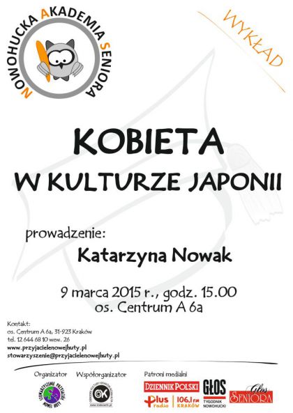 Kolejny wykład w ramach Nowohuckiej Akademii Seniora poprowadzi Katarzyna Nowak, wicedyrektor Muzeum Sztuki i Techniki Japońskiej Manggha. Wychodząc od obrazu kobiety w mitologii japońskiej prowadząca przedstawi jak kształtowały się model rodziny oraz rola kobiet w kulturze japońskiej na przestrzeni epok. Nie zabraknie także opowieści o tym z jakimi wyzwaniami musi zmierzyć się współczesna Japonka.