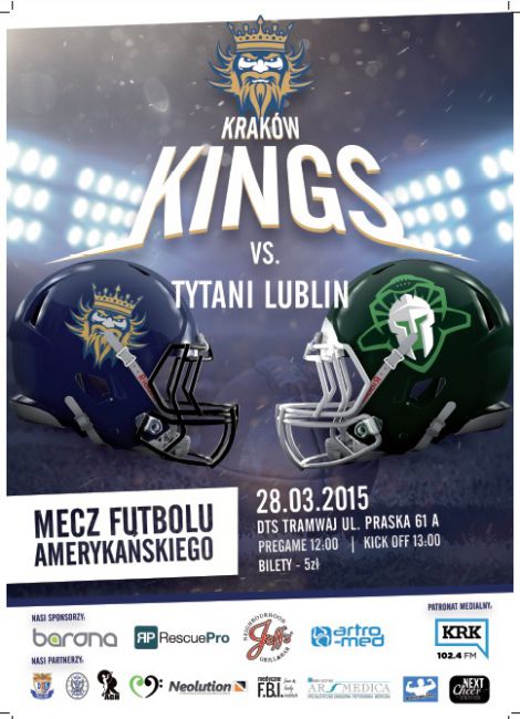 o godzinie 13:00 na stadionie DTS Tramwaj przy ul. Praskiej drużyna Kraków Football Kings rozpoczyna swoje zmagania w Polskiej Lidze Futbolu Amerykańskiego. Jej rywalami