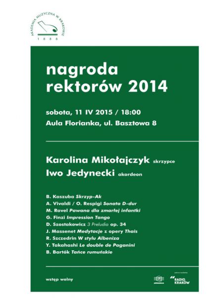 W sobotę 11 kwietnia o godzinie 18:00 w Auli Florianka (ul. Basztowa 8) odbędzie się koncert duetu skrzypcowo-akordeonowego Karoliny Mikołajczyk i Iwo Jedyneckiego – studentów Uniwersytetu Muzycznego Fryderyka Chopina w Warszawie, którzy w listopadzie 2014r. otrzymali nagrodę Rektorów Polskich Uczelni Muzycznych oraz Nagrodę Stowarzyszenia Autorów ZAiKS. W ramach tej nagrody młodzi muzycy występują w Salach Koncertowych wszystkich Uczelni Muzycznych w Polsce. Na repertuar zespołu składają się utwory, z których wiele to kompozycje oryginalne na skrzypce i akordeon powstałe w XX i XI wieku. Muzycy chętnie sięgają też do dzieł z różnych epok przeznaczonych na skrzypce i fortepian. Transkrypcje akordeonowe partii fortepianu dokonane przez Iwa Jedyneckiego sprawiają, że znane utwory zyskują nowe, ciekawe brzmienie.