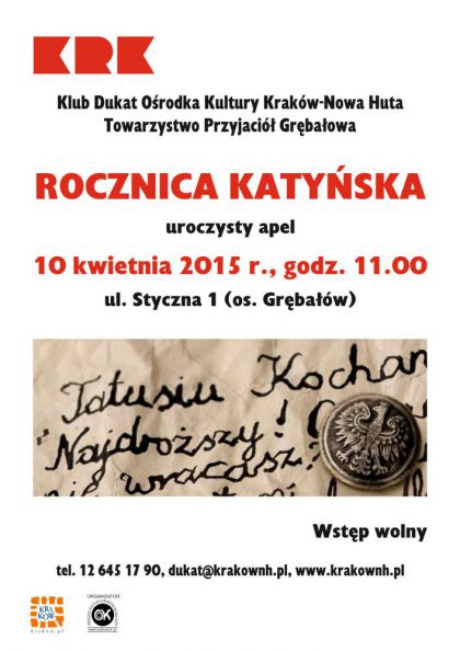 10 kwietnia br. od godz. 11.00 zapraszamy wszystkich mieszkańców Grębałowa i okolic na uroczysty apel poległych, złożenie kwiatów i zapalenie zniczy pod kamieniem katyńskim, który znajduje się na terenie Klubu Dukat Ośrodka Kultury Kraków-Nowa Huta (ul. Styczna 1).