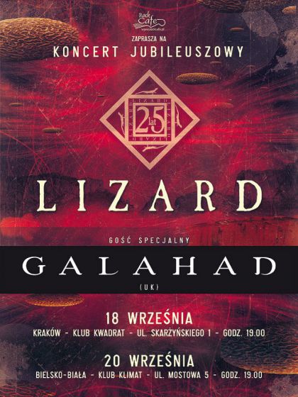 25 urodziny progrockowej kapeli LIZARD i gość specjalny z Anglii GALAHAD. LIZARD– Rok 2015 to dla zespołu LIZARD z Bielska – Białej jubileusz ćwierćwiecza działalności. Powstanie zespołu datowane jest na rok 1990 roku, ale pierwszy album udało im się wydać dopiero w 1996 roku. Efekt pracy był jednak piorunujący. Płyta „W galerii Czasu” zatrząsnęła rynkiem progresywnego rocka do tego stopnia, że już w kolejnym roku Lizard został zaproszony do zagrania koncertu dla 8 tysięcznej widowni w katowickim Spodku przed światową ikoną rocka progresywnego Emerson Lake & Palmer. Niedługo po tym wydarzeniu zespół zagrał przed kolejną gwiazdą – PORCUPINE TREE. Lizard stał się stałym bywalcem na scenach całej Europy czego efektem był album koncertowy „Noc żywych Jaszczurów”. Na kolejną płytę musieliśmy czekać aż do 2004r. Zaczął się okres wzmożonej aktywności zespołu, który zaowocował kolejnymi studyjnymi wydawnictwami „Psychopulus” (2004), „Tales From The Artichoke Wood” (2005) oraz „SPAM” (2006). „Master & M” ujrzał światło dzienne w 2013 roku i kontynuuje styl zespołu rozpoznawalny od czasów debiutu. Album kipi mnogością pomysłów, jest dziełem bardzo dojrzałym, przemyślanym i wciągającym. Został świetnie przyjęty przez fanów, którzy głośno zaczęli się domagać powrotu Jaszczurów na scenę. Pod koniec 2014 i na początku 2015 roku LIZARD zagrał kilka koncertów, między innymi wystąpił obok legendy polskiego rocka SBB. Efektem tej aktywności koncertowej jest album live „Destruction And Little Pieces Of Cheese”, zrealizowany w czasie jednego łódzkiego koncertu, gdzie oprócz własnego materiału LIZARD zdecydował się zagrać utwór swoich wielkich mistrzów KING CRIMSON. „Schizofrenik 21” made In Lizard wieku wyszedł porywająco, podobnie jak cały materiał!