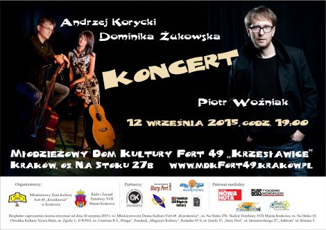 W sobotę 12 września 2015 r., na dziedzińcu fortecznym MDK Fort 49 „Krzesławice” w Krakowie, os. Na Stoku 27b, wystąpią w duecie Dominika Żukowska i Andrzej Korycki oraz w solowym recitalu Piotr Woźniak. Występ odbędzie się w ramach koncertu „Pożegnanie lata”. Początek o godzinie 19:00. Wstęp bezpłatny.
