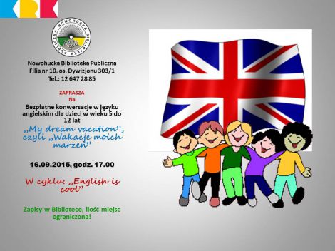 Biblioteka na zajęcia konwersacyjne w języku angielskim dla dzieci w wieku od 5 – 12 lat. „My dream vacation”, czyli „Wakacje moich marzeń”. Spotkanie odbywa się w cyklu: English is cool. Na pierwszym spotkaniu dzieci przypomną sobie słownictwo związane z wakacjami poprzez ćwiczenia językowe i zabawy edukacyjne.