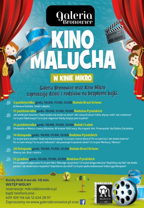 Bajki emitowane będą trzykrotnie w sobotę 31 października w godzinach 10.00-10.50, 11.00-11.50 oraz 12.00-12.50 w Kinie Mikro – na 1 piętrze Galerii. Wejście na seans jest bezpłatne, należy jednak dokonać wcześniejszej rezerwacji mailem: mikro@kinomikro.pl bądź telefonicznie: 609 109 116 lub 12 634 28 97.