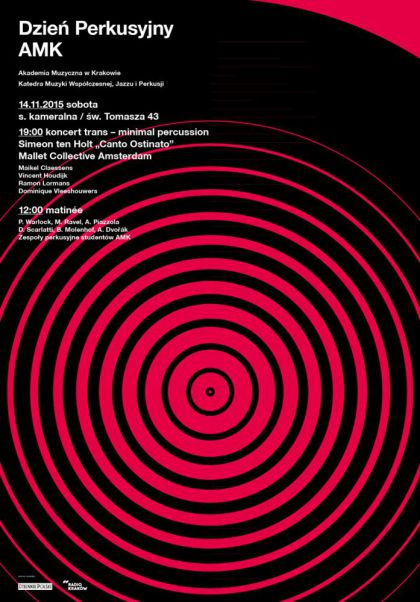 Katedra Muzyki Współczesnej, Jazzu i Perkusji po raz kolejny zaskoczy swoich sympatyków. A to już w sobotę 14 listopada o godzinie 19:00, kiedy to zabrzmi utwór ciekawostka, minimal perkusyjny popularny w Holandii, Canto Ostinato Simeona Ten Holta. Utwór trwać będzie ok. 70 minut, a publiczność może na koncert przyjść z poduszkami, by poddać się jego kontemplacji. Wstęp wolny.