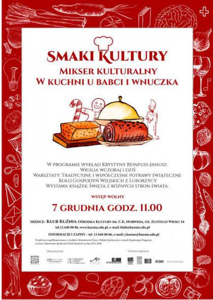 Smaki kultury to międzypokoleniowy projekt, łączący starszych i młodszych pasjonatów kultury i sztuki kulinarnej. Wspólnie realizowane spotkania, będą miejscem dialogu, inspirującej rozmowy, wspólnego gotowania, wymiany myśli, wiedzy i przepisów kulinarnych. Projekt ma na celu integrację wewnątrz i międzypokoleniową w oparciu o kulturę, literaturę i film.