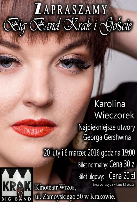 Big Band Krak- krakowski zespół grający muzykę jazzową i rozrywkową w dniach 20 lutego oraz 6 marca o godzinie 19.00 da dwa koncerty, podczas których przy współpracy krakowskim kwartetem smyczkowym Bonjour zostaną zaprezentowane najpiękniejsze utwory i kompozycje Georga Gershwina oraz standardy jazzu big bandowego. Gwiazdą wieczoru będzie solistka Opery Krakowskiej- Karolina Wieczorek. Imprezę poprowadzi również solista Opery Krakowskiej- Franciszek Makuch. Koncerty odbędą się w Kinoteatrze Wrzos, przy ulicy Zamoyskiego 50, w Krakowie. Bilety w cenie 30zł normalny i 20zł ulgowy / studencki do nabycia w kasie KT Wrzos.